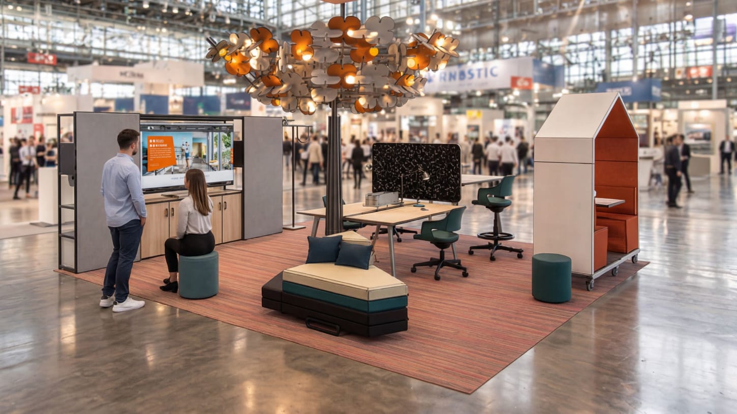 Besondere Elemente unseres Messeauftritts schaffen eine Atmosphäre, die Aufenthaltsqualität und Funktion verbindet: offene Arbeitsbereiche, integrierte Beratungssituationen, modular gedachte Einrichtungslösungen und ein aufmerksamkeitsstarker räumlicher Mittelpunkt, der den Stand als Ort der Begegnung erlebbar macht.